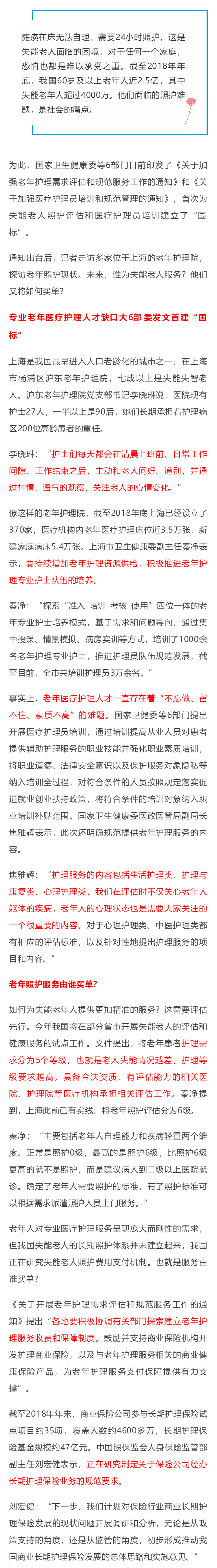 为聚焦老年患者特别是失能老年患者护理服务需求,增加老年护理服务供给,提高老年人健康水平和生活质量。2018年,在深入调查研究、总结国内外老年护理实践经验的基础上,结合我国老年人群常见疾病特点、护理需求和临床护理实践等,我委会同财政部、人力资源和社会保障部、国家市场监督管理总局、中国银行保险监督管理委员会、国家中医药管理局等相关部门组织制定了《关于开展老年护理需求评估和规范服务工作的通知》和《关于加强医疗护理员培训和规范管理工作的通知》(征求意见稿)。经过充分讨论,多次征求意见,反复修改完善,形成了《关于开展老年护理需求评估和规范服务工作的通知》和《关于加强医疗护理员培训和规范管理工作的通知》。
